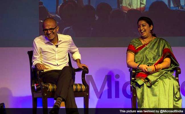 Microsoft CEO Satya Nadella along with Union Human Resource Development Minister Smriti Irani